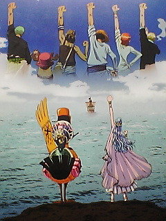 ワンピースの画像でビビとの別れのシーンのルフィーたちが左手を挙げて