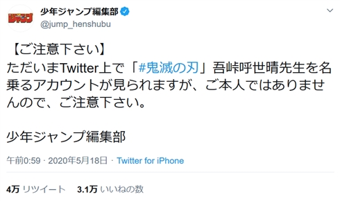 鬼滅の刃 作者の成り済ましアカウントが登場 ジャンプ編集部が 本人
